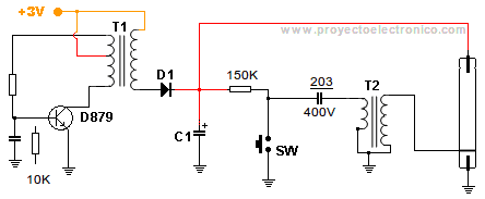 Đây không phải là vấn đề lớn vì chúng ta có thể tự chế tạo biến áp kích hoạt, và nếu chúng ta muốn độ sáng cao hơn, chúng ta có thể thay đổi giá trị của tụ C1 và để phục hồi tốc độ, hãy tăng giá trị của tụ C3 lên đến 1 µF, tốt hơn là có kích thước tốt để tránh quá nhiệt., ví dụ như tụ điện của lò vi sóng hoặc tụ điện khởi động động cơ quạt (110V.)